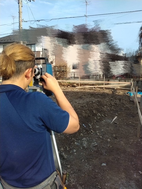 トランシットを据えてキッチリカネ(直角)を出しました!この作業は基礎工事に関わるとっても大事な作業なのです✌️