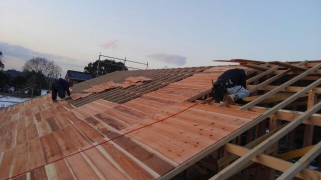 【注文住宅】久喜市O様邸 屋根施工が順調に進んでいます。 2018.02.05 屋根垂木も終わり、今日から野地板施工です。 野地板とは、屋根の下地とするため、垂木の上に貼る板です。 野地板には無垢の杉板を使用します。 木裏を上向きに取付です。 基本中の基本です! 埼玉県白岡市・久喜市・蓮田市・さいたま市周辺で新築住宅をお考えの方はお気軽に菱沼建設までご相談ください。 ブログトップ | 前の記事へ | 次の記事へ