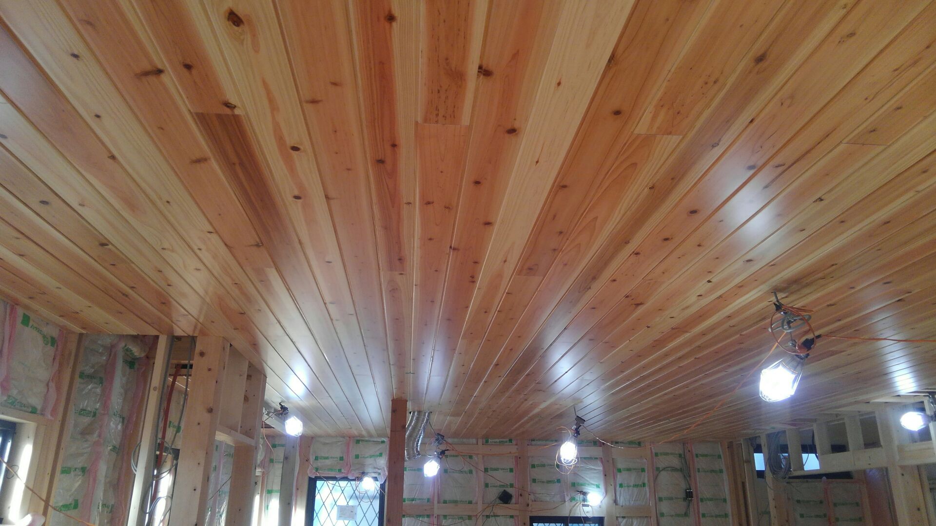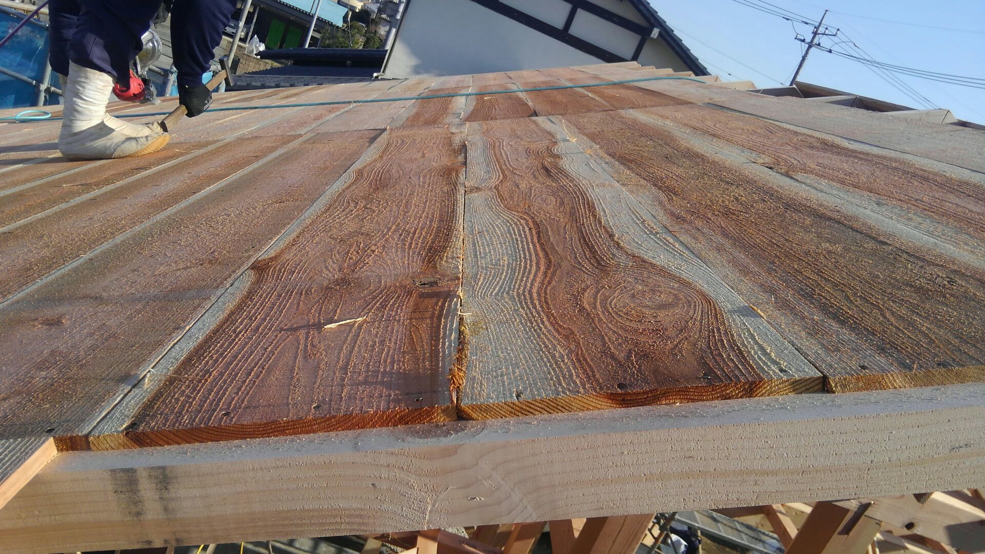 杉無垢の野地板、木裏が上基本ですね!