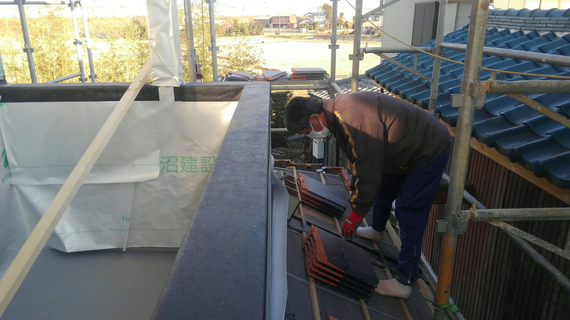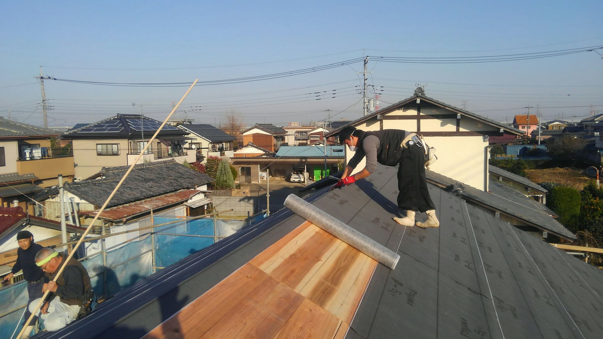 大屋根が終わった瓦屋さん、お次は下屋根にとりかかります。