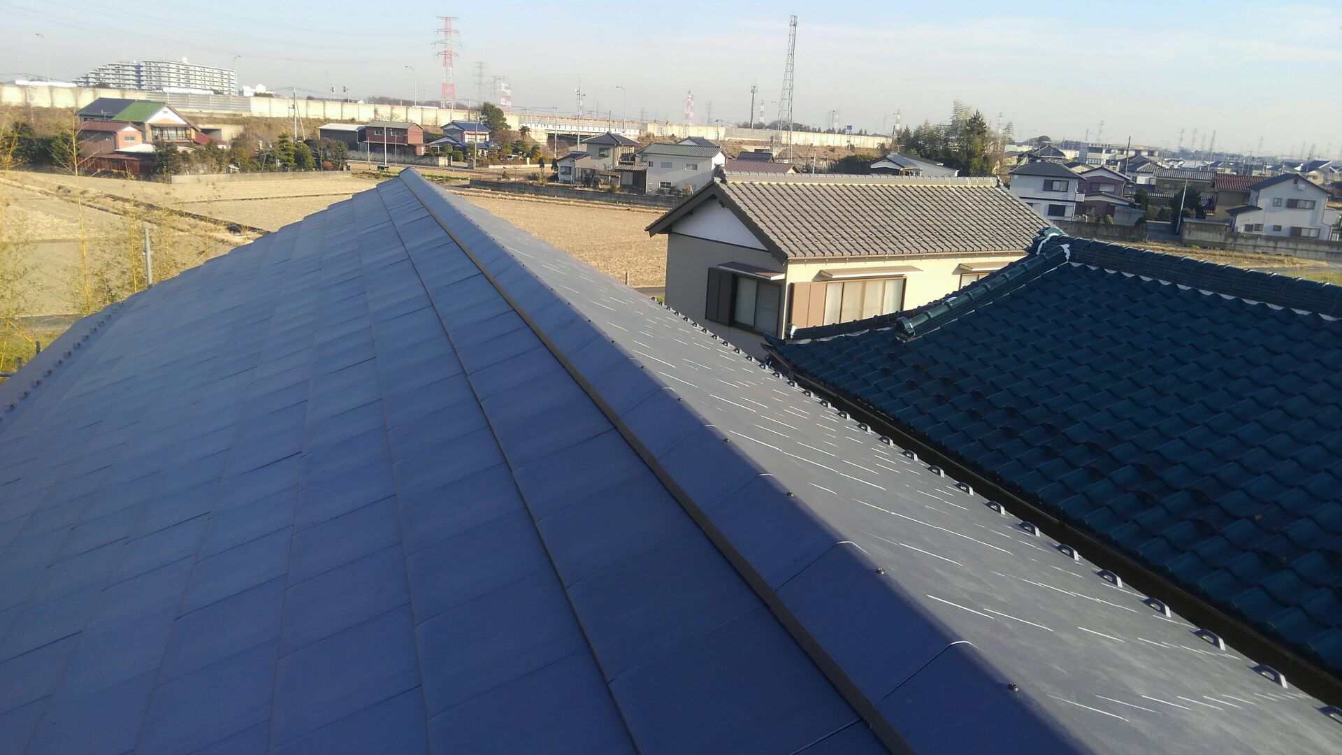凹凸の無いスッキリとした平瓦。素敵で見事な大屋根ですね。