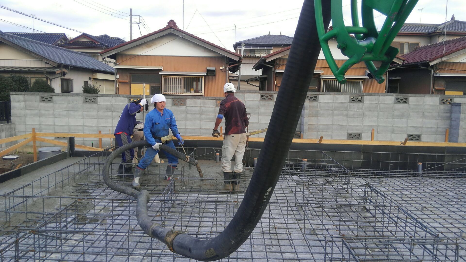 生コン圧送車、通称ポンプ車を使って打ち込みです。