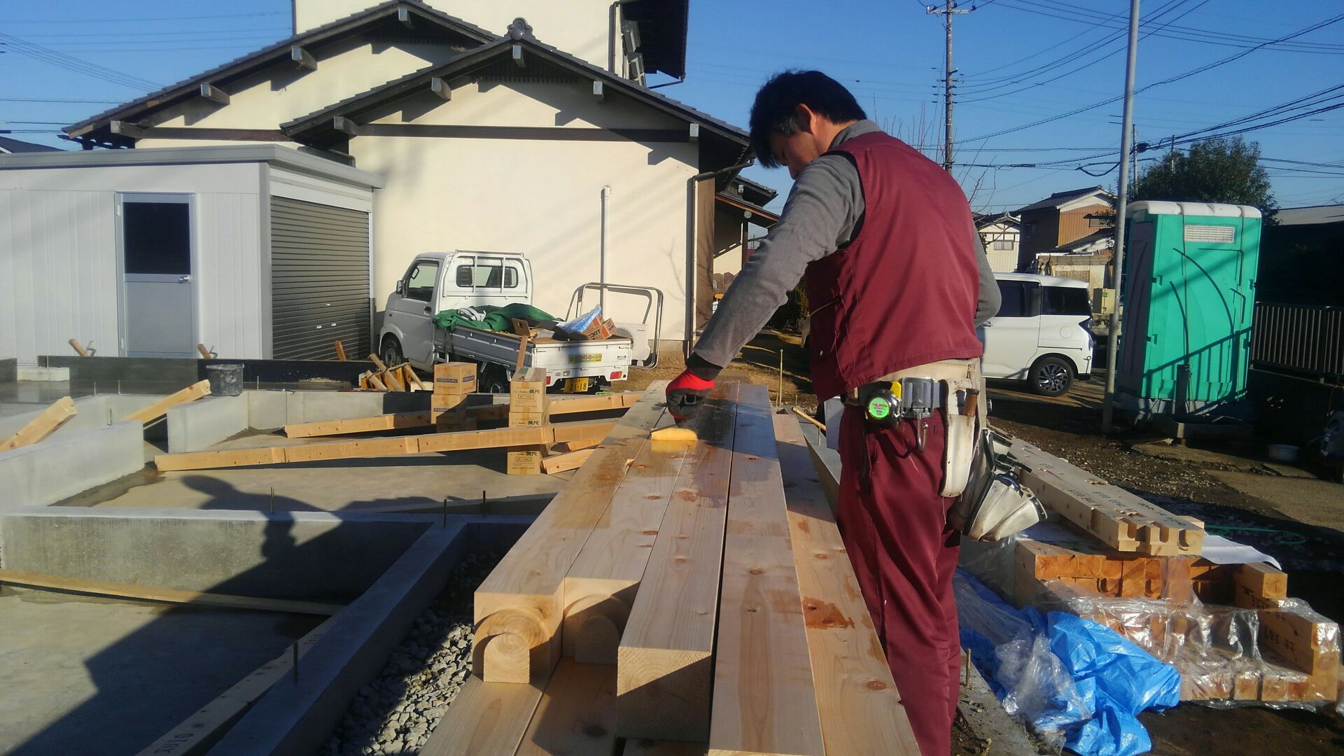 上棟に向け、大工さん達が土台敷きに来ました。