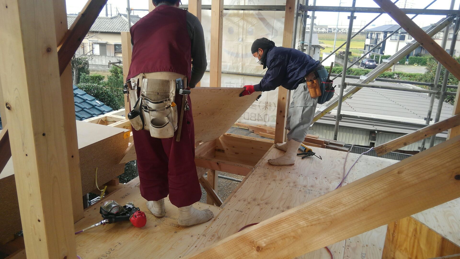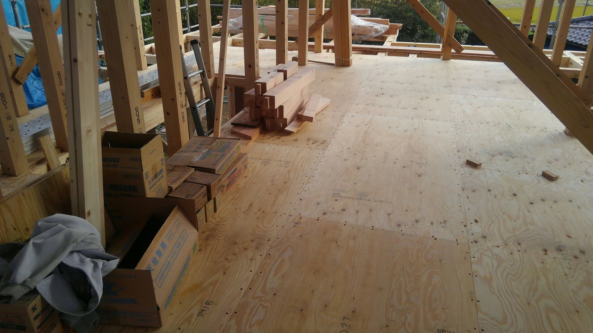 24㎜の合板を75㎜の専用くぎを使い150㎜ピッチ以内で施工します。