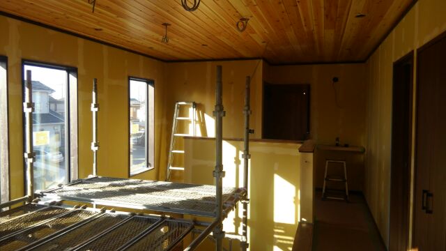 大工さんの木工事が終わり、クロス屋さんが現場に入りました。